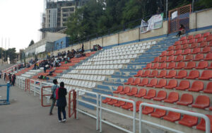 خواهرهای دوقلوی فرحزادی در جایگاه زنان هورا میکشند. بیشتر سکوهای تماشاچیان خالی است.